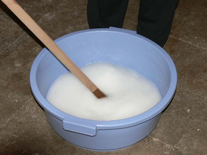 Agua y sosa cáustica, removemos despacio con un palo largo